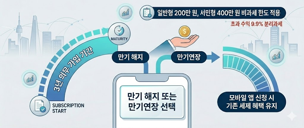 만기연장은 모바일 앱에서 신청할 수 있습니다. 연장 시 기존 세제 혜택 구조가 유지됩니다.