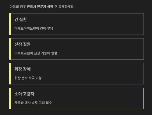 - 간 질환이 있는 사람 : 아세트아미노펜 성분이 간에 부담을 줄 수 있음