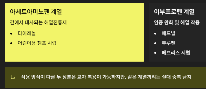 | 아세트아미노펜 계열 | 간에서 대사되는 해열진통제 | 타이레놀, 어린이용 챔프 시럽 등 |