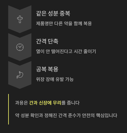 따라서 약 성분을 확인하고, 정해진 시간 간격을 반드시 지키는 것이 안전한 섭취의 핵심입니다.