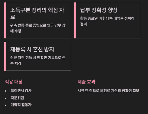예를 들어 프리랜서 강사나 자문위원의 활동이 끝났을 때 이 문서를 제출하면, 활동 종료일 이후의 납부가 정리된다.