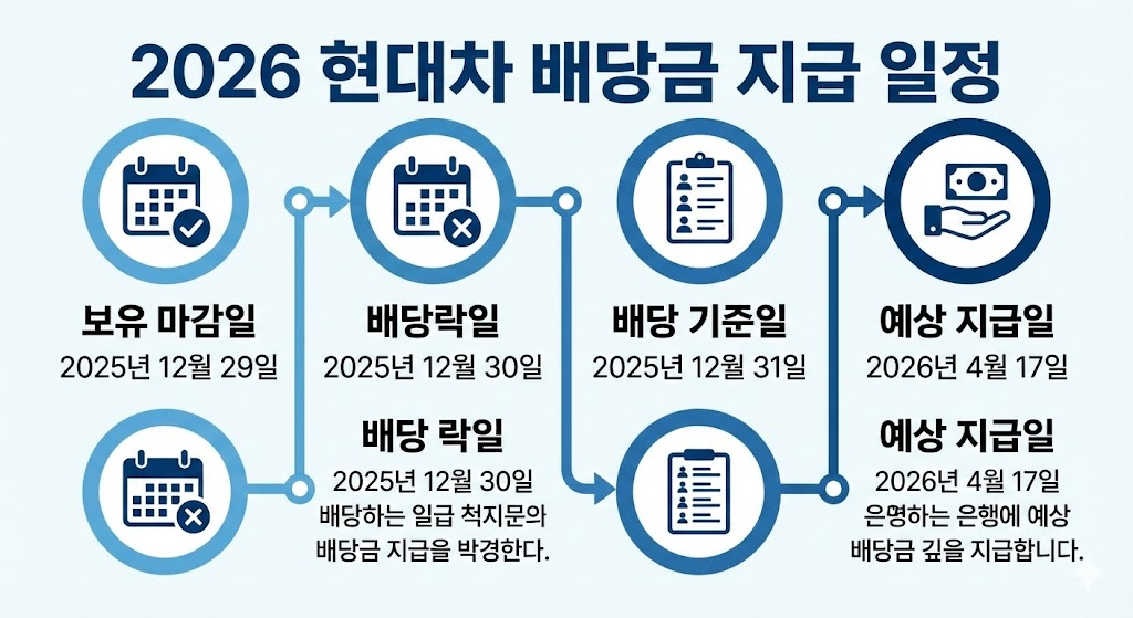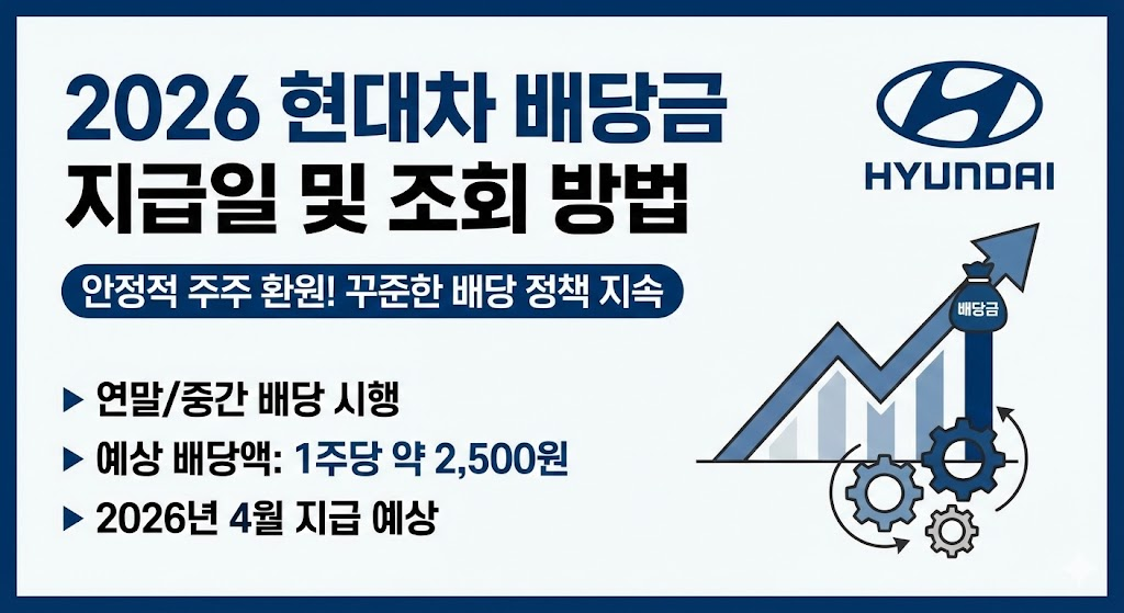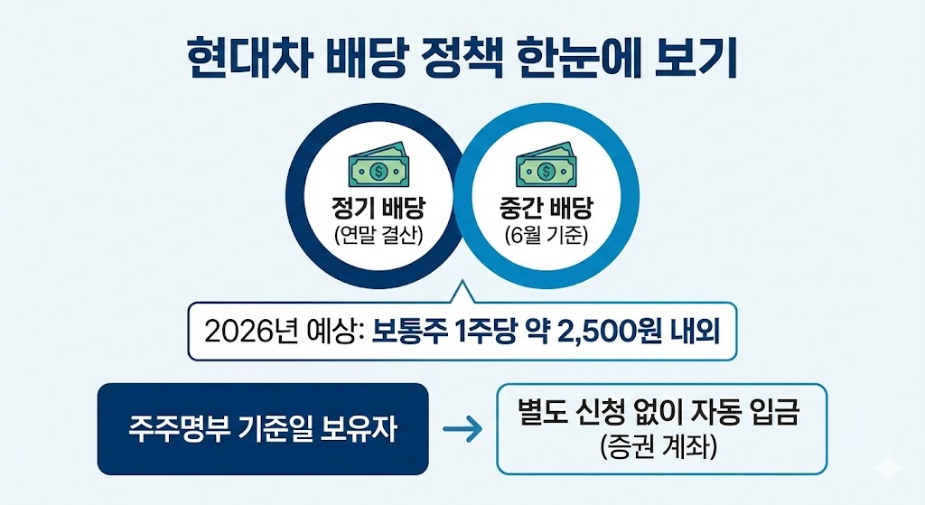 2026년 현대차 배당금은 2025년 12월 31일 기준 주주명부에 등재된 투자자에게 2026년 4월 중순경 자동 지급될 예정입니다.