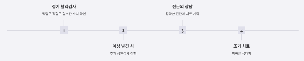 정기적인 건강검진은 혈액암을 조기에 발견할 수 있는 가장 확실한 방법 중 하나입니다. 혈액검사에서 백혈구, 적혈구, 혈소판 수치의 이상이 발견되면 추가적인 정밀검사를 진행합니다. 가족 중 혈액 관련 질환 병력이 있다면 주기적인 검사로 위험도를 낮출 수 있습니다.