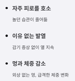 | 밤에 땀, 고열 | 감기 아닌데 반복되는 열 | 식은땀이나 오한 동반 여부 |