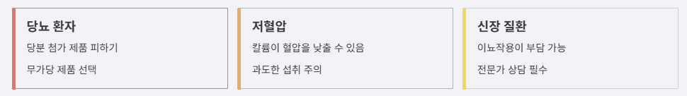 • 저혈압인 경우 : 칼륨이 혈압을 낮출 수 있으므로 과도한 섭취는 피해야 합니다.
