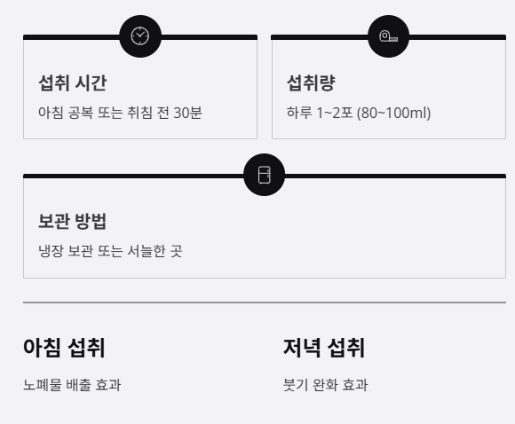 • 섭취 시간 : 아침 공복 또는 취침 전 30분