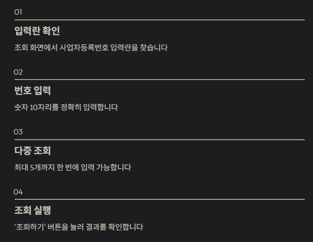 이곳은 로그인 절차가 전혀 필요 없으며, 사업자등록번호만으로 즉시 확인이 가능합니다.