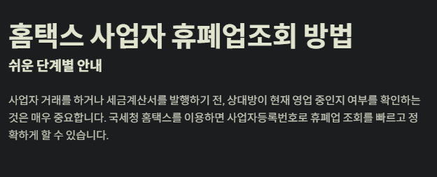 사업자 거래를 하거나 세금계산서를 발행하기 전, 상대방이 현재 영업 중인지 여부를 확인하는 것은 매우 중요합니다. 이를 간단하게 확인할 수 있는 곳이 바로 국세청 홈택스입니다. 오늘은 홈택스에서 사업자등록번호로 휴폐업 조회를 빠르고 정확하게 하는 방법을 단계별로 정리했습니다.