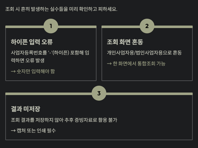 - 조회 화면을 개인사업자용/법인사업자용으로 혼동 → 한 화면에서 통합조회 가능