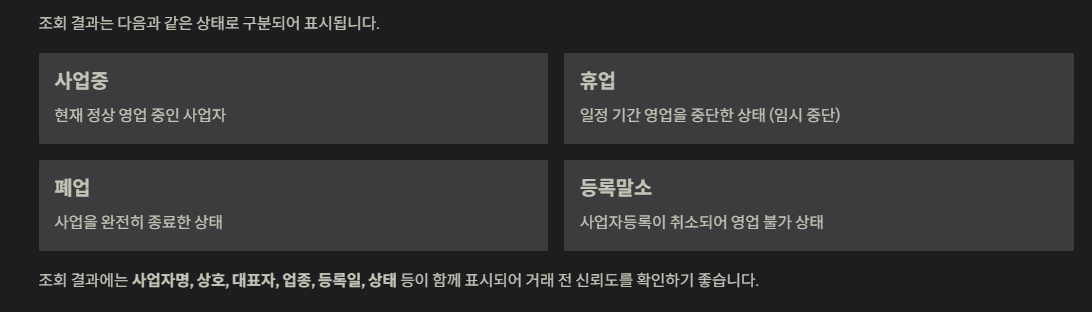 결과에는 사업자명, 상호, 대표자, 업종, 등록일, 상태 등이 함께 표시되어 거래 전 신뢰도를 확인하기 좋습니다.