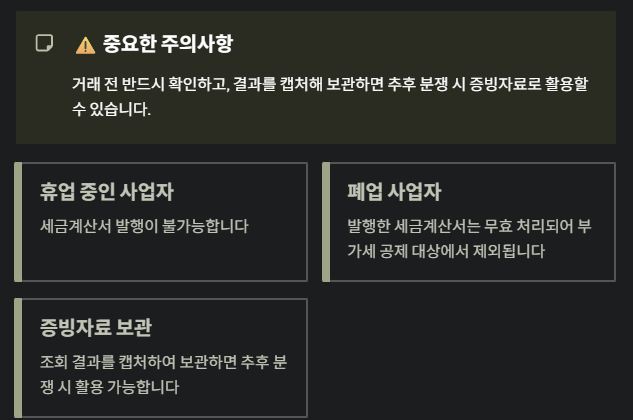 - 휴업 중인 사업자와 거래 시 세금계산서 발행 불가합니다.
