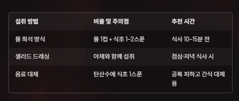 A. 식사 10~15분 전에 1~2스푼을 물에 희석해 마시는 방식입니다. 식욕 억제와 혈당 조절에 도움이 됩니다.