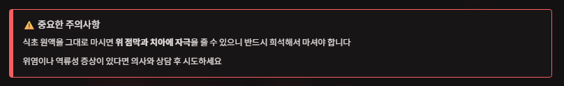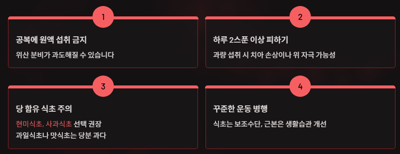 A. 공복에 원액을 마시면 위 자극이 생길 수 있으므로 반드시 희석해서 섭취해야 하며, 과량 섭취는 피해야 합니다.