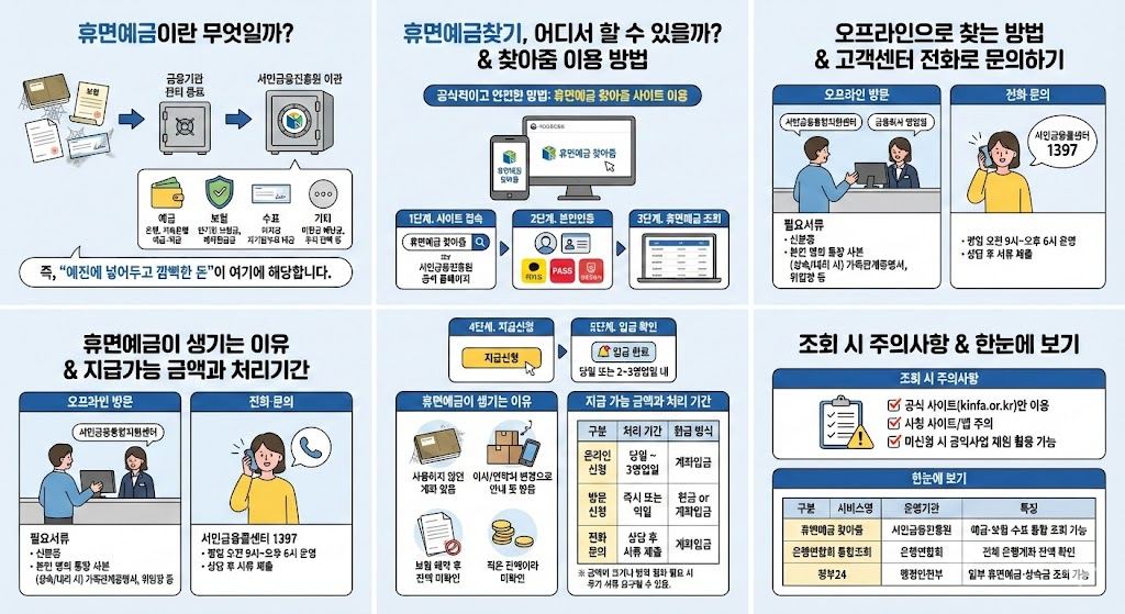| 휴면예금 찾아줌 | 서민금융진흥원 | 예금·보험·수표 통합 조회 가능 |