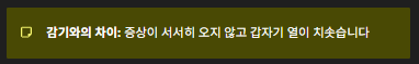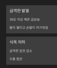 | 1단계 | 고열, 오한 | 체온 급상승, 떨림, 식욕 저하 |