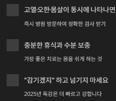 2025년 독감은 예년보다 강한 형태로 나타나고 있습니다. 증상 자체가 빠르게 진행되기 때문에 “감기겠지” 하고 넘기면 더 심해지는 경우가 많습니다. 이번 글을 정리하면서 느낀 점은, 독감의 시작 신호를 빨리 알아차리는 것이 회복의 핵심이라는 것입니다. 고열, 오한, 몸살이 동시에 나타난다면 주저하지 말고 병원에서 정확한 검사를 받는 것이 좋습니다. 무엇보다 충분한 휴식과 수분 보충이 가장 좋은 치료임을 잊지 말아야 합니다.