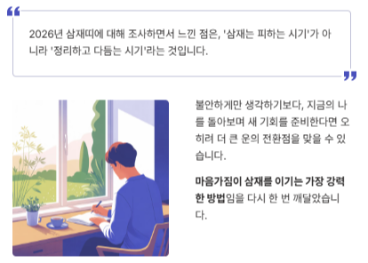 ‘삼재는 피하는 시기’가 아니라 ‘정리하고 다듬는 시기’라는 것입니다. 불안하게만 생각하기보다, 지금의 나를 돌아보며 새 기회를 준비한다면 오히려 더 큰 운의 전환점을 맞을 수 있습니다. 결국 마음가짐이 이기는 가장 강력한 방법임을 다시 한 번 깨달았습니다.