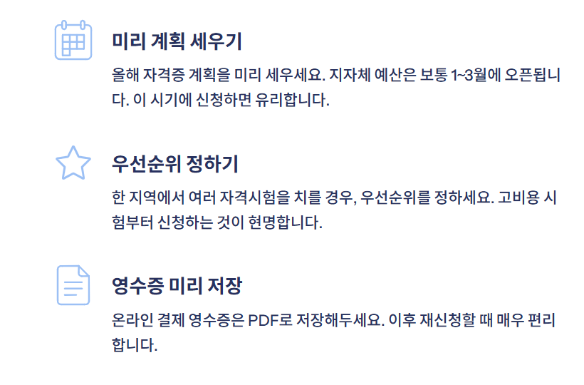 우선순위를 정해 고비용 시험부터 신청하는 것이 유리합니다. - 온라인 결제 영수증은 PDF로 저장해두면 이후 재신청 때 편리합니다.