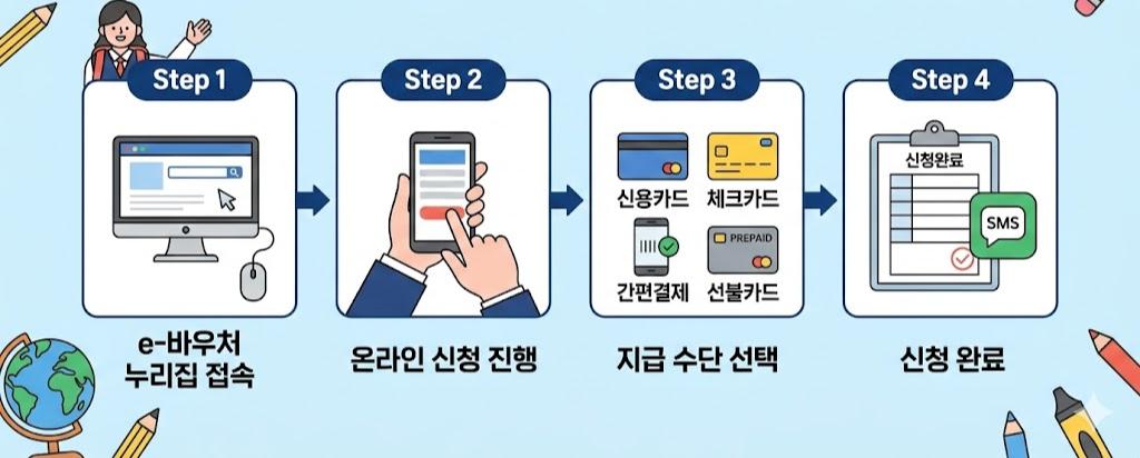 신청은 교육급여 바우처 e-바우처 누리집 에서 온라인으로 진행됩니다.