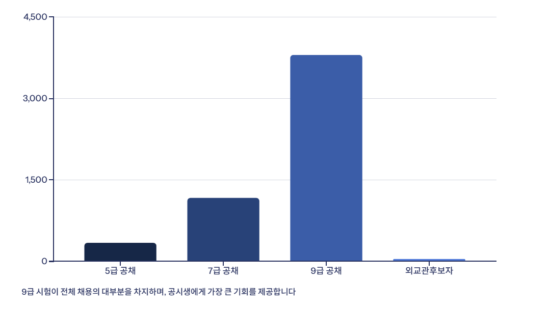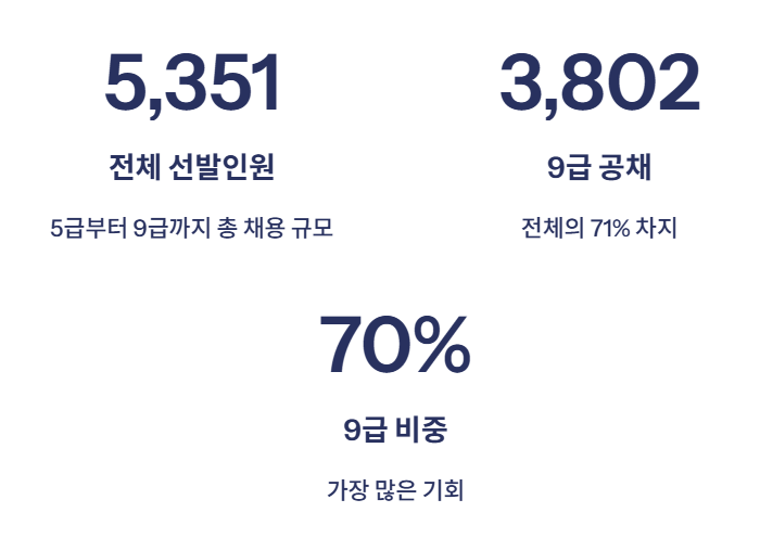 즉, 올해 전체 국가직 공개채용 중 약 70% 이상이 9급 시험을 통해 선발됩니다. 여전히 9급은 가장 많은 인원을 뽑는 중심 시험이라 할 수 있습니다.