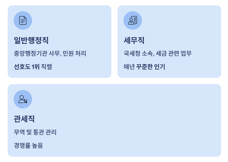 | 세무직 | 국세청 소속, 세금 관련 업무 | 매년 꾸준한 인기 |