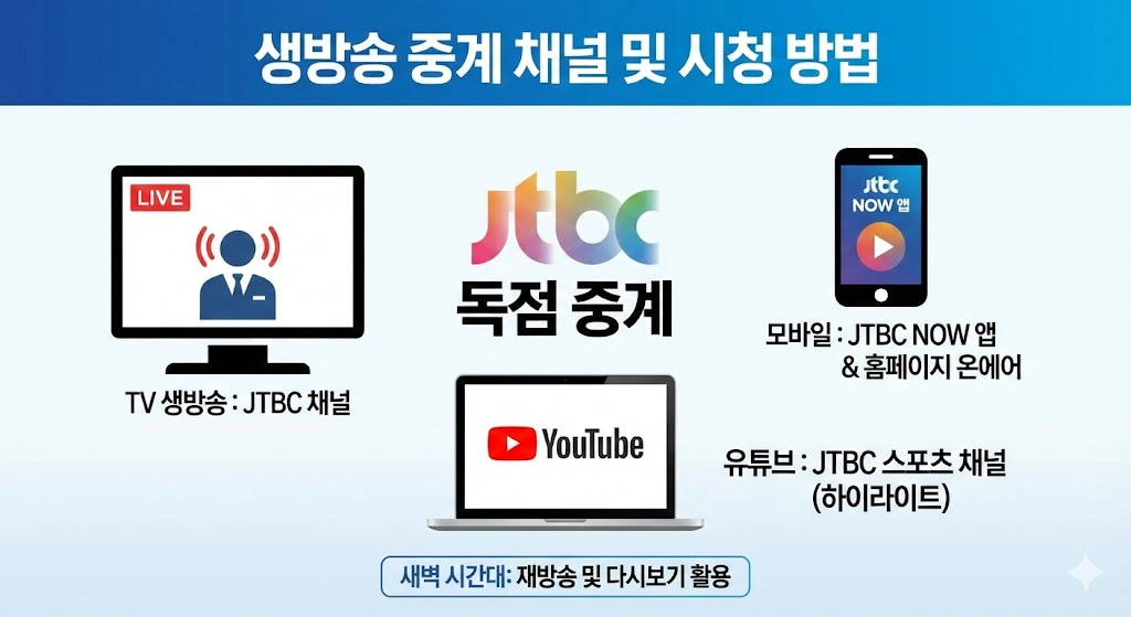 이 외에도 케이블 채널을 통해 재방송 및 하이라이트가 제공될 예정이니, 새벽 시간 시청이 어렵다면 재방송 편성을 확인해 두는 것이 좋습니다.