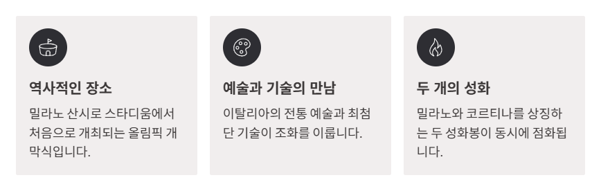 이번 개막식은 처음으로 축구 경기장인 산시로 스타디움에서 열리며, 이탈리아의 예술과 음악, 첨단 기술이 어우러진 공연이 준비되고 있습니다. 또한 전통적인 성화 점화식 대신 두 개의 성화봉이 함께 타오르는 퍼포먼스가 공개될 예정이라 큰 화제를 모으고 있습니다.