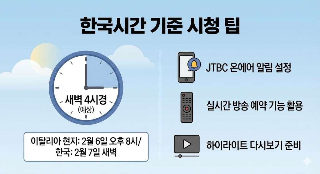 한국에서는 JTBC가 2026년 동계올림픽의 독점 중계권을 확보했습니다. 따라서 개막식부터 주요 경기까지 모든 방송을 JTBC를 통해 생중계로 볼 수 있습니다.