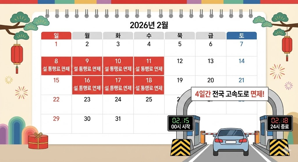 2026년 설 연휴 통행료 면제는 다음 기간 동안 적용됩니다.
