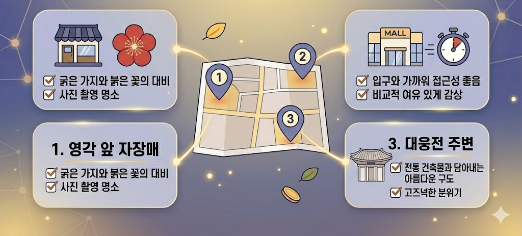 영각 앞 자장매는 가장 유명한 촬영 포인트입니다. 고목의 굵은 줄기와 붉은 꽃이 대비를 이루며 인상적인 장면을 연출합니다.