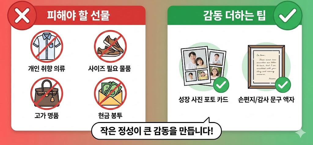 개인 취향이 강한 의류나 사이즈가 필요한 물품은 피하는 것이 좋습니다. 또한 고가의 명품 제품은 부담이 될 수 있습니다.