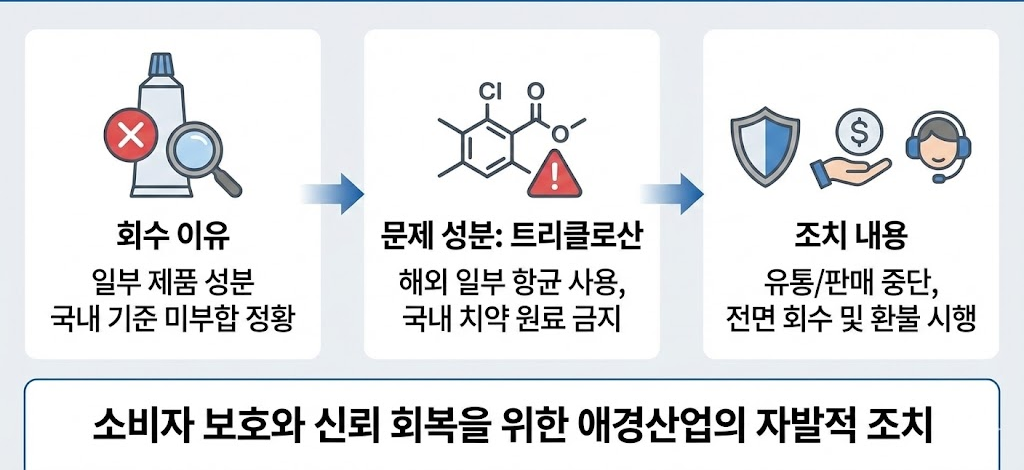 해당 제품의 유통과 판매를 전면 중단했습니다. 해당 성분은 트리클로산(Triclosan)으로, 일부 해외에서는 항균 성분으로 사용되지만 국내에서는 치약 원료로 금지되어 있습니다. 이에 따라 애경산업은 소비자 보호와 신뢰 회복을 위해 자발적으로 회수 및 환불 조치를 시행하고 있습니다.