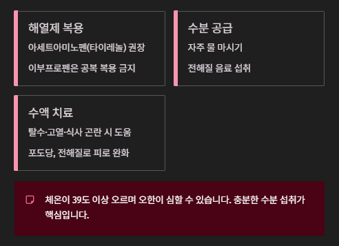 • 해열제: 아세트아미노펜(타이레놀) 성분 권장