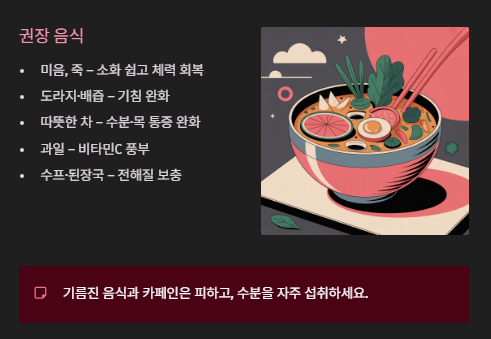 • 수프나 된장국 : 전해질과 수분을 보충.