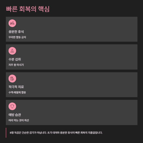 특히 B형은 근육통과 피로감이 심해 몸살처럼 느껴지며,