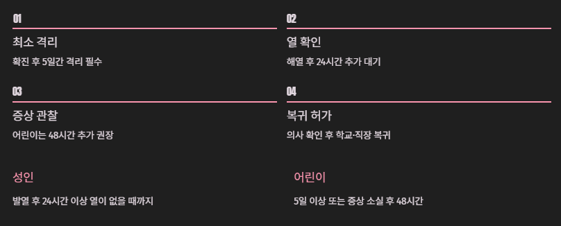 A. 보통 5일 이상이며, 열이 내린 뒤 최소 24시간이 지나야 복귀가 안전합니다.