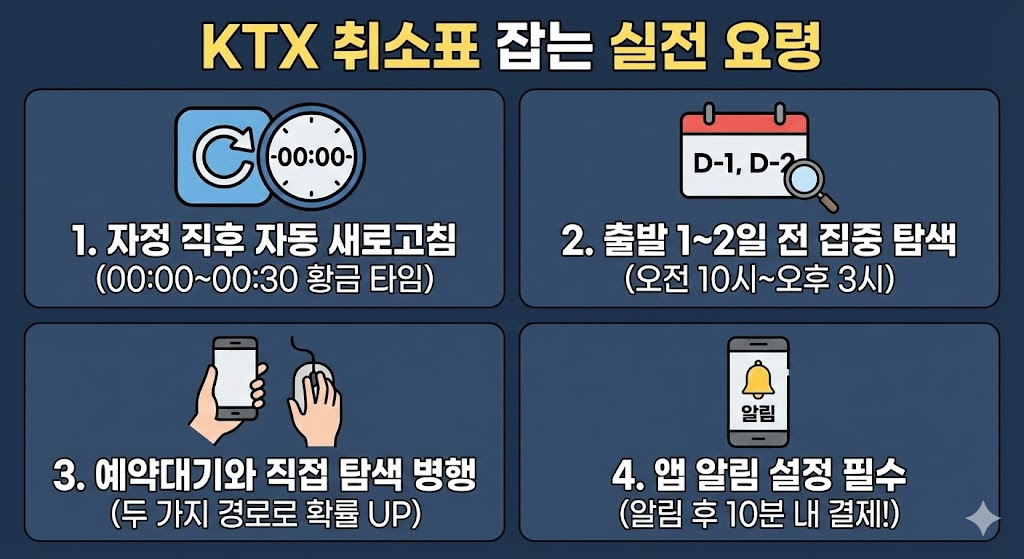 KTX 취소표는 “운”이 아니라 타이밍과 습관의 싸움입니다. 특히 자정 직후, 출발 이틀 전, 그리고 당일 아침은 표가 풀리는 주요 구간이기 때문에 이때 집중적으로 확인하는 것이 좋습니다. 또한 예약대기 서비스를 활용하면 취소표가 나올 때 자동으로 알려주므로